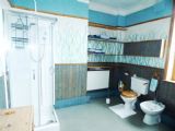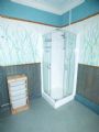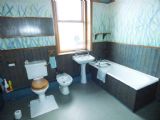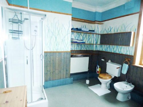 Containing a white five piece suite with chrome fittings comprising: panelled bath, low flush wc, pedestal wash basin, bidet and a separate step in shower cubicle with electric shower. Decorative pine panelling to midway. Central heating radiator. Useful fitted shelving and storage cabinets. Sealed unit double glazed window to the rear.